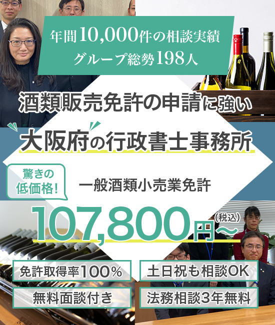 行政書士法人ORCA(旧:倉敷昭久事務所)の行政書士は、大阪府・兵庫県全域のお客様の酒類販売の許可申請を無料面談日から最短即日で着手対応しております。お客様のビジネスで必要な酒類販売の免許・許可申請がある場合、まずは無料面談のお問い合わせをお願い致します。弊所の行政書士が暖かくご対応させていただきます。